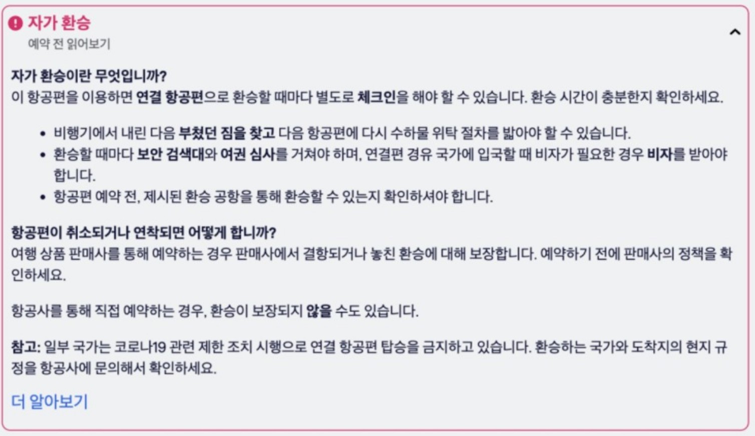 자가 환승이란? 비행기를 이용하시면 연결 항공편으로 환승할 때마다 별도 체크인을 해야 합니다.