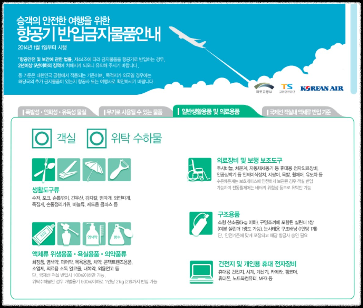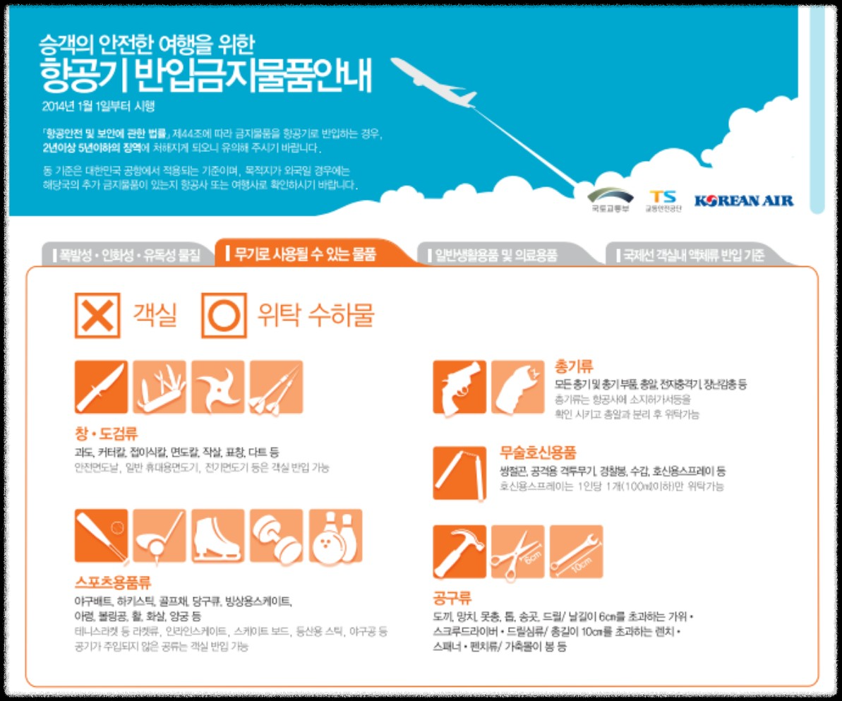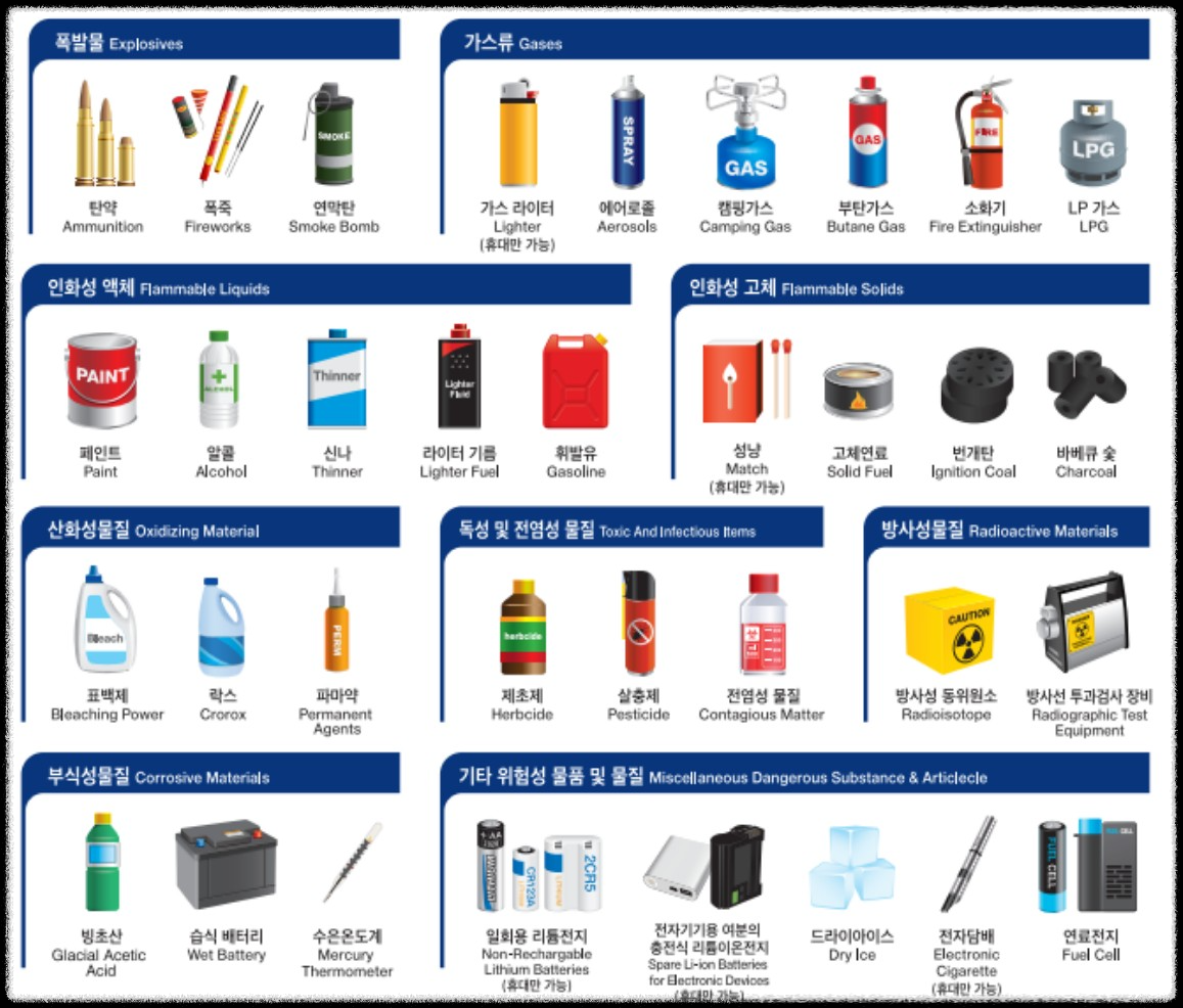 국내선, 국제선 기내 및 위탁 수화물 금지물품은 폭발물질, 인화성물질, 방사성, 전염성, 독성 물질 등 상식적인 위험성 물질은 당연히 금지물품입니다.