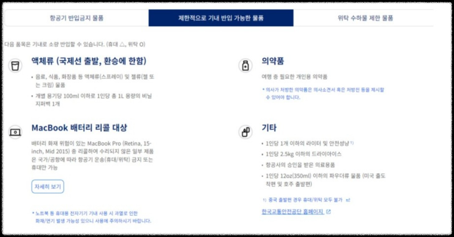 특히 화장품과 김치 등 식품이 액체로 포함되는 점 꼭 알아두세요!