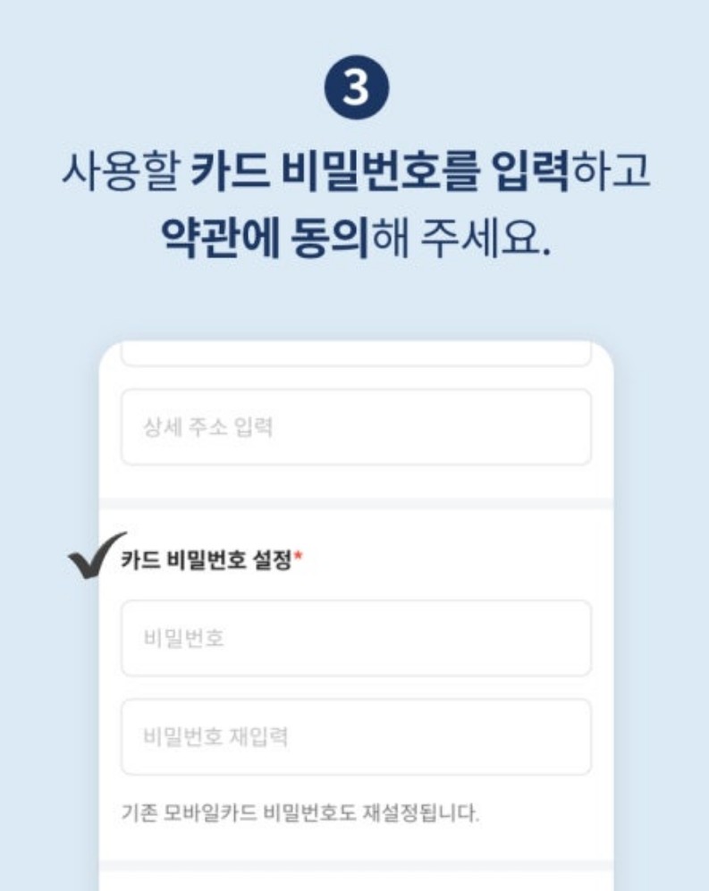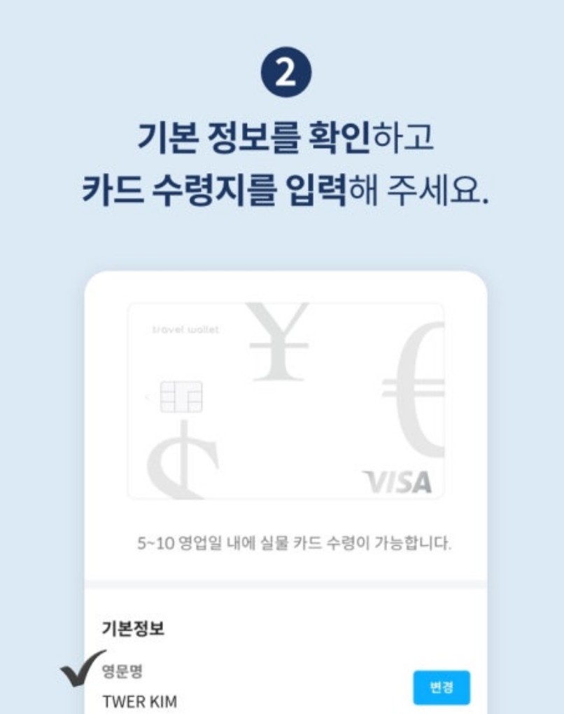 실물카드 신청방법은 발급을 원하는 카드 디자인을 선택합니다. 기본 정보를 확인하고 카드 수령지를 입력합니다. 사용할 카드 비밀번호를 입력하고 약관에 동의합니다. 배송지와 영문명을 다시 한번 확인합니다.
