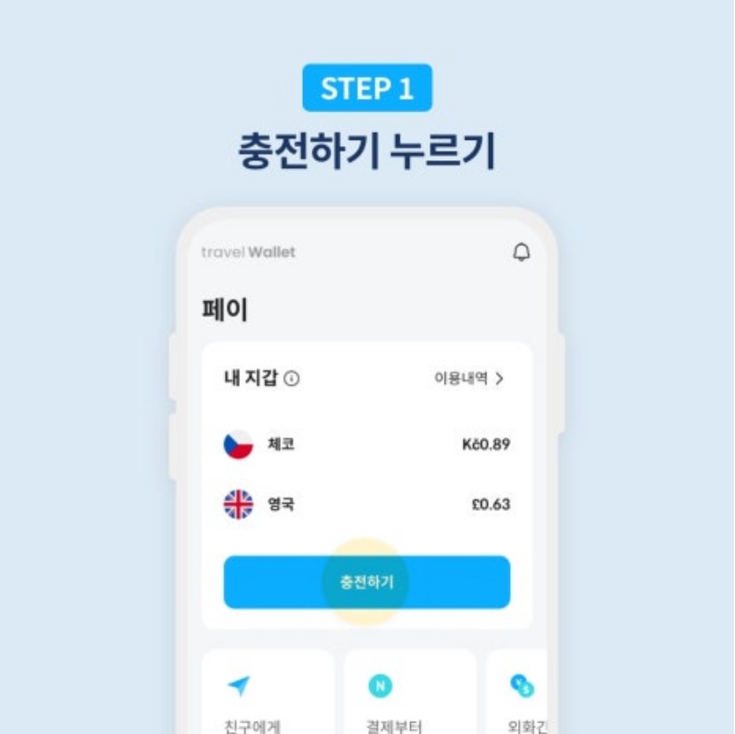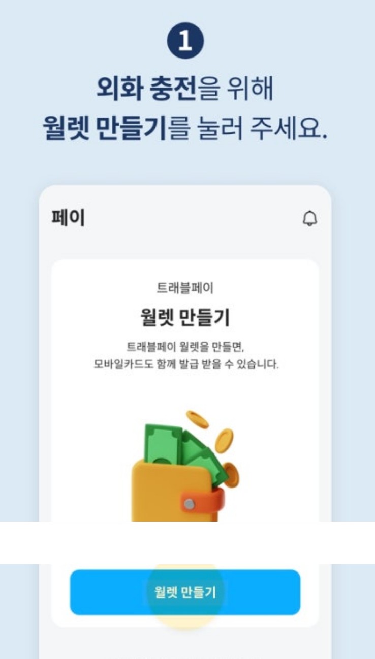 트래블월렛 앱에 가입하면 월렛의 '내 지갑'에서 충천하기 버튼을 누리면 됩니다.